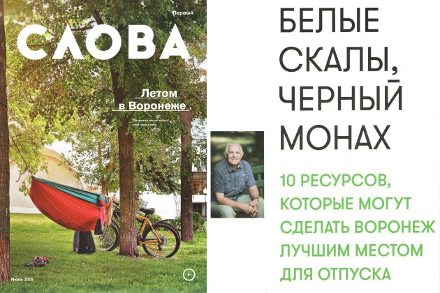 В Воронеже запустился печатный ежемесячный журнал «Слова», который пишет про городскую культуру, людей и интересные места. Первый номер с надписью на обложке «Три десятка причин любить свой город в июле» посвящён лету в городе. Внутри — большой материал о самых красивых местах Воронежской области, списки летних дел и покупок и многое другое. Первый номер вышел тиражом в 5 тысяч экземпляров. Журнал будет распространяться бесплатно и с 1 июля появится в городских заведениях.